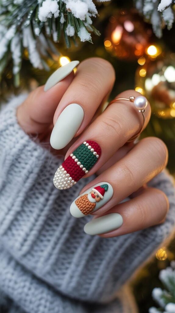 Soft mint green polish frames two accent nails — one with a 3D Santa face complete with a red hat and rosy cheeks, the other a bold red-and-green sweater stripe with pearl accents. The remaining nails? Matte mint for that ‘just wrapped myself in a cozy blanket’ feel — playful, charming, and totally Instagram-worthy.”