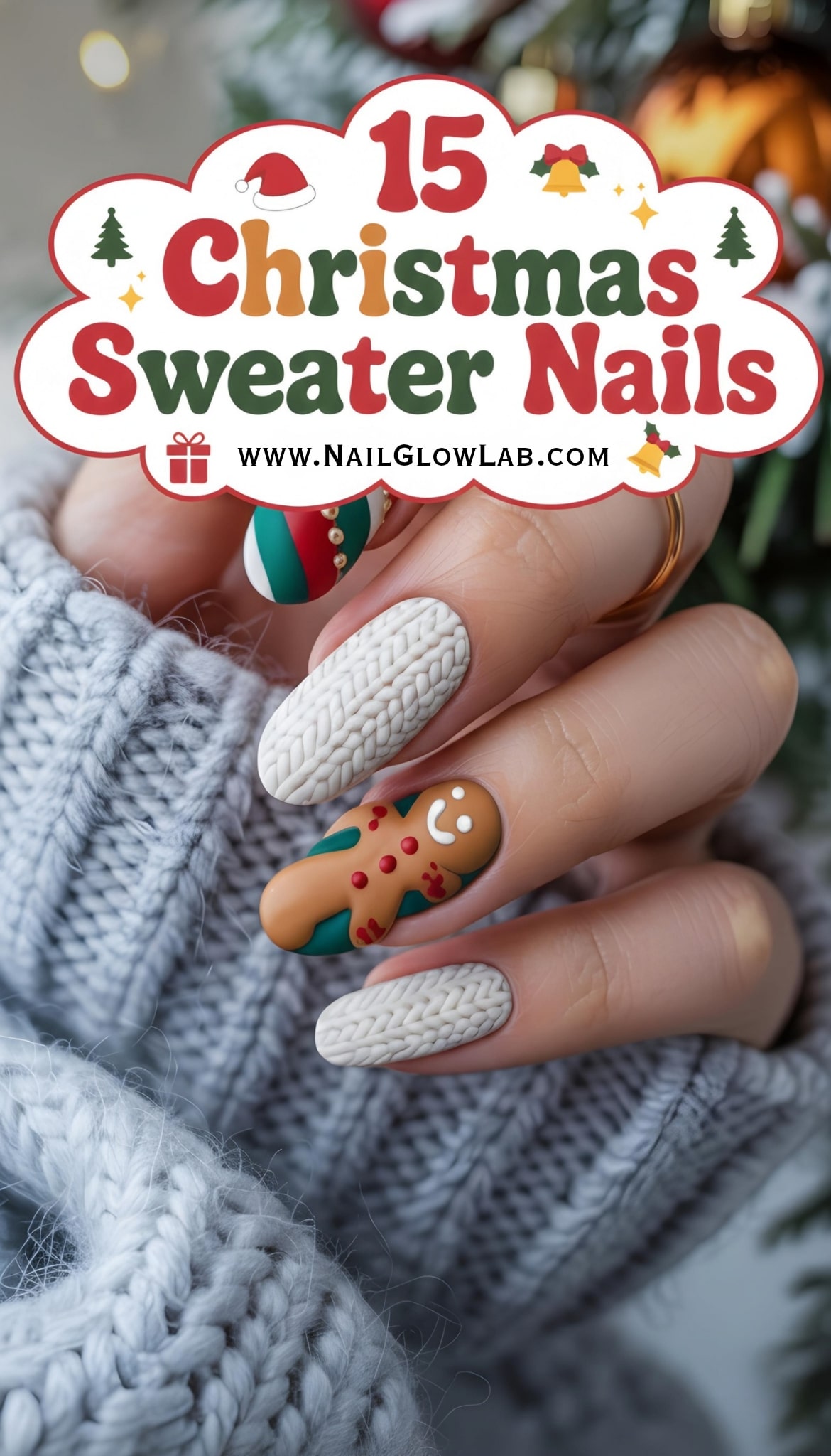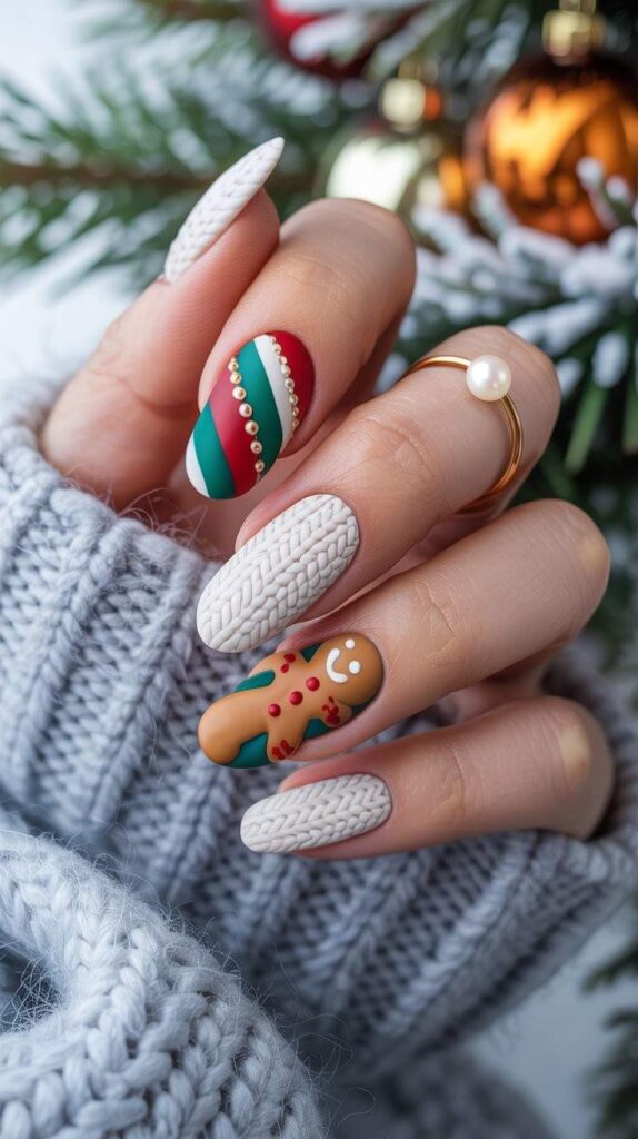 “Soft cream polish frames two accent nails — one with a 3D gingerbread man dripping with white icing, the other a bold red-and-green striped sweater pattern. The remaining nails? Textured cable knit for that ‘just pulled on my favorite holiday sweater’ feel — cozy, nostalgic, and totally wearable.”