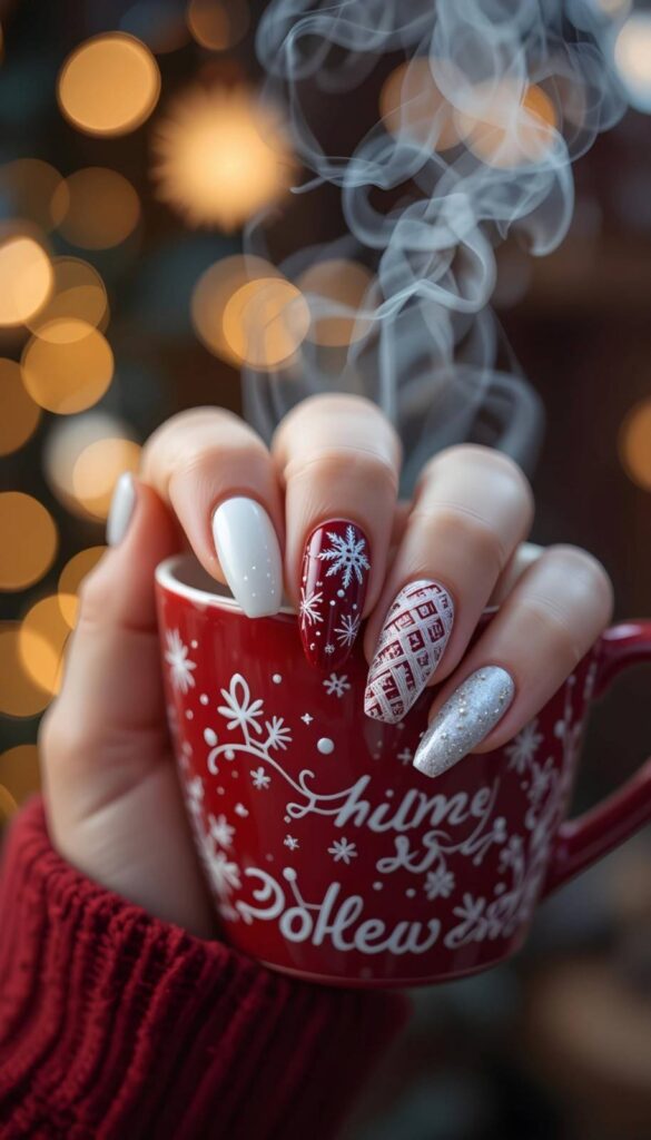 “Rich red polish frames two accent nails — one with a glossy white snowflake, the other a textured knit pattern. The remaining nails? Speckled with snowy white dots for that ‘just wrapped myself in a cozy blanket’ feel — playful, charming, and totally Instagram-worthy.”