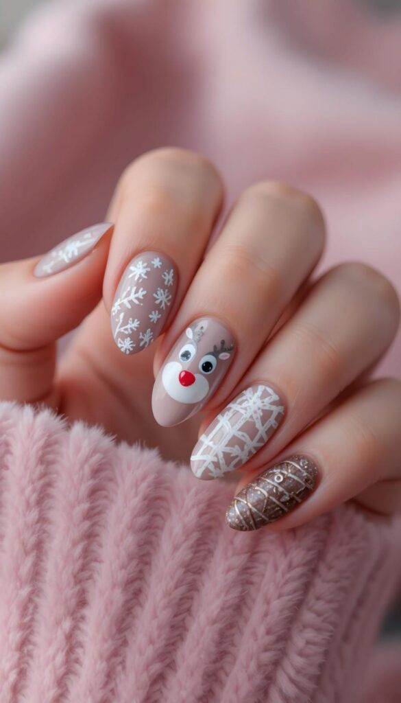 “Crisp nude polish frames two accent nails — one with a hand-painted reindeer (complete with big eyes and an orange nose), the other a glittery snowflake design. The remaining nails? Speckled with tiny silver stars and rhinestones for that ‘just unwrapped a gift’ feel — elegant, whimsical, and totally photo-ready.”
