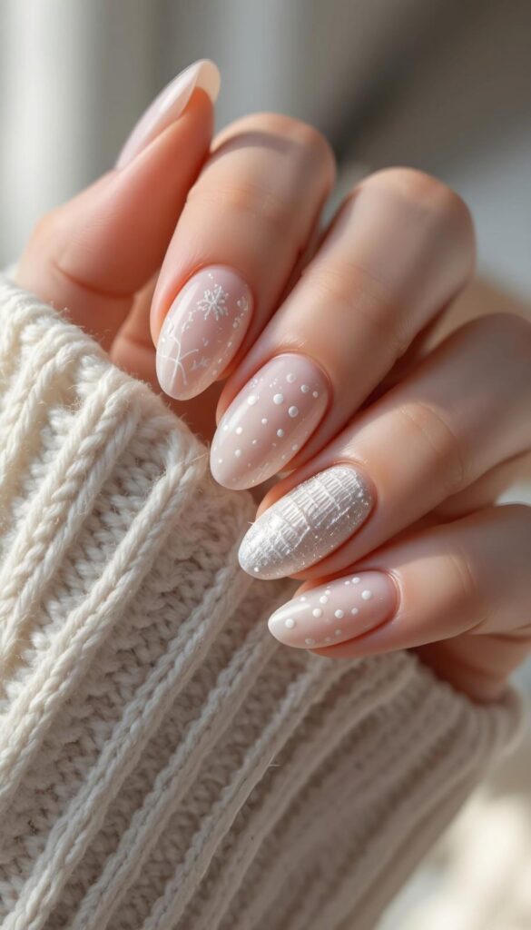 “Soft blush pink polish frames two accent nails — one with a delicate knit-stitch pattern, the other a glossy white base with tiny snowflakes. The remaining nails? Speckled with snowy white dots for that ‘just walked through a winter wonderland’ feel — sweet, serene, and totally wearable.”