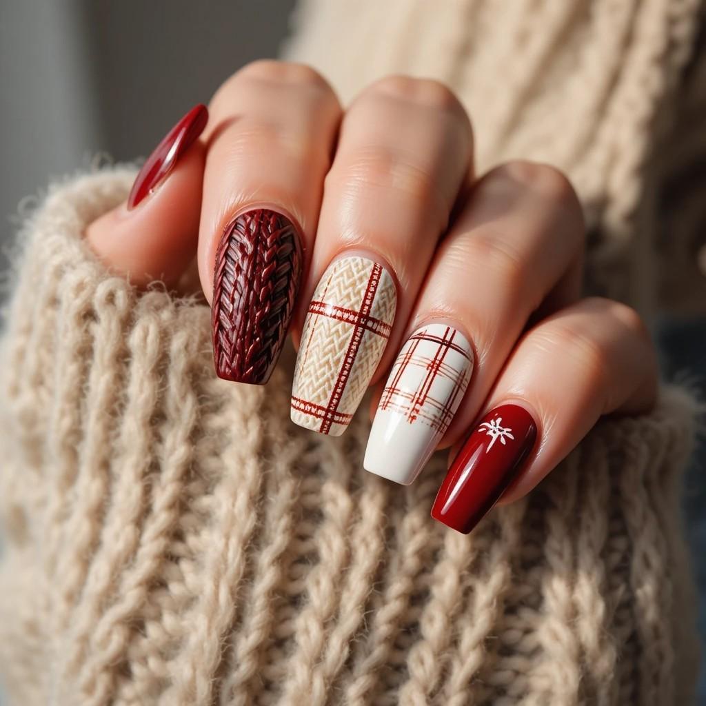 “Soft cream polish frames two accent nails — one with a bold red plaid pattern, the other a textured herringbone knit. The remaining nails? Glossy red tips for that classic holiday pop — sweet, serene, and totally wearable.”