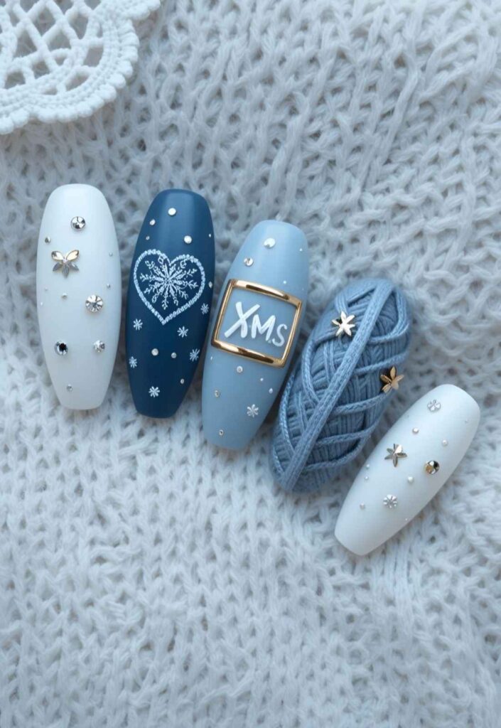 “Matte blue polish frames two accent nails — one with a giant white snowflake heart, the other a gold-framed ‘XMS’ lettering. The remaining nails? Speckled with tiny silver stars and rhinestones for that ‘just unwrapped a gift’ feel — elegant, whimsical, and totally photo-ready.”