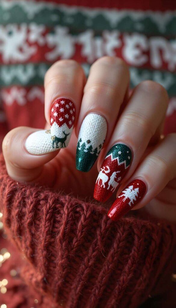 Forget basic red-and-green polish: these 15 Christmas sweater nail designs are all about texture, charm, and that just-pulled-on-my-favorite-holiday-sweater vibe. Think cable knits, plaid patterns, 3D mittens, and reindeer faces that look like they’ve been stitched onto your nails with holiday love.