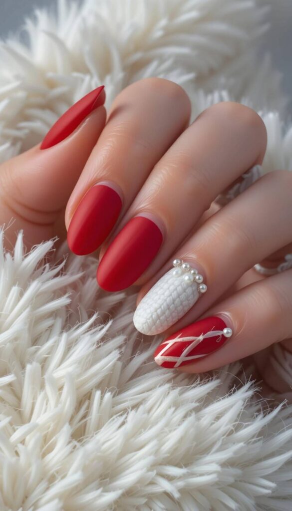 “Crisp red polish frames two accent nails — one with a glossy white cable knit pattern, the other a pearl-accented bow design. The remaining nails? Matte red for that ‘just wrapped myself in a cozy blanket’ feel — playful, charming, and totally Instagram-worthy.”