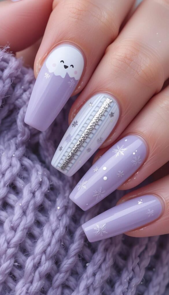 “Soft lavender polish gets a winter upgrade with delicate knit-stitch designs on two accent nails — each featuring a giant white snowflake crowned with a rhinestone. The rest? Speckled with silver glitter stripes for that ‘just walked through a winter wonderland’ feel — elegant, serene, and perfect for pairing with chunky knits.”