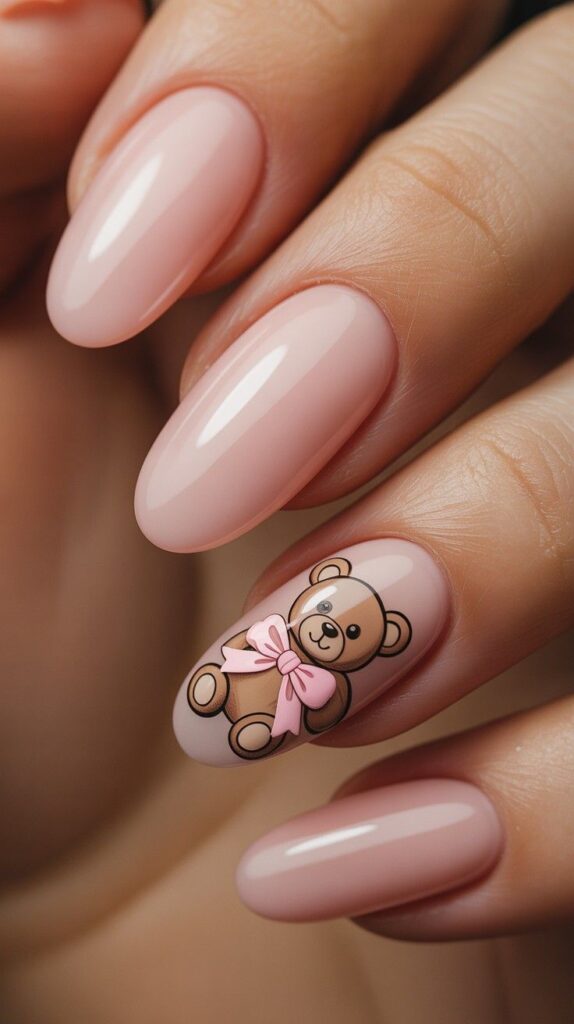 Clean nude polish meets bold cartoon teddy bear with pink bow — modern, chic, and perfect for showing off your winter boots. The matte-to-glossy gradient adds depth, while the minimalist base lets the design shine. Paired with real snowflakes, this design whispers ‘minimalist magic’ with every step.