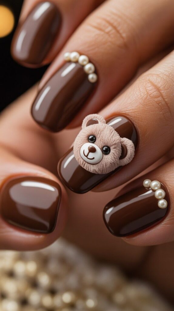 Rich velvet cocoa polish meets sculpted 3D teddy bear face with pearl accents — playful, romantic, and perfect for showing off your winter boots. The glossy finish makes it pop without overpowering your look, while the sharp stiletto shape elongates the fingers. Paired with a cozy knit sweater, this design whispers ‘festive glam’ with every step.