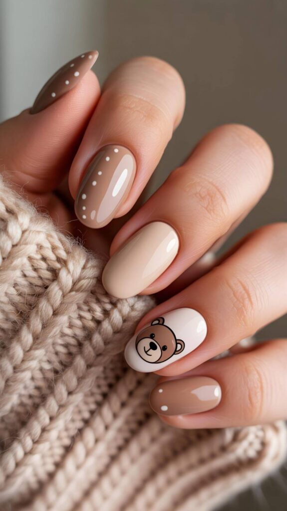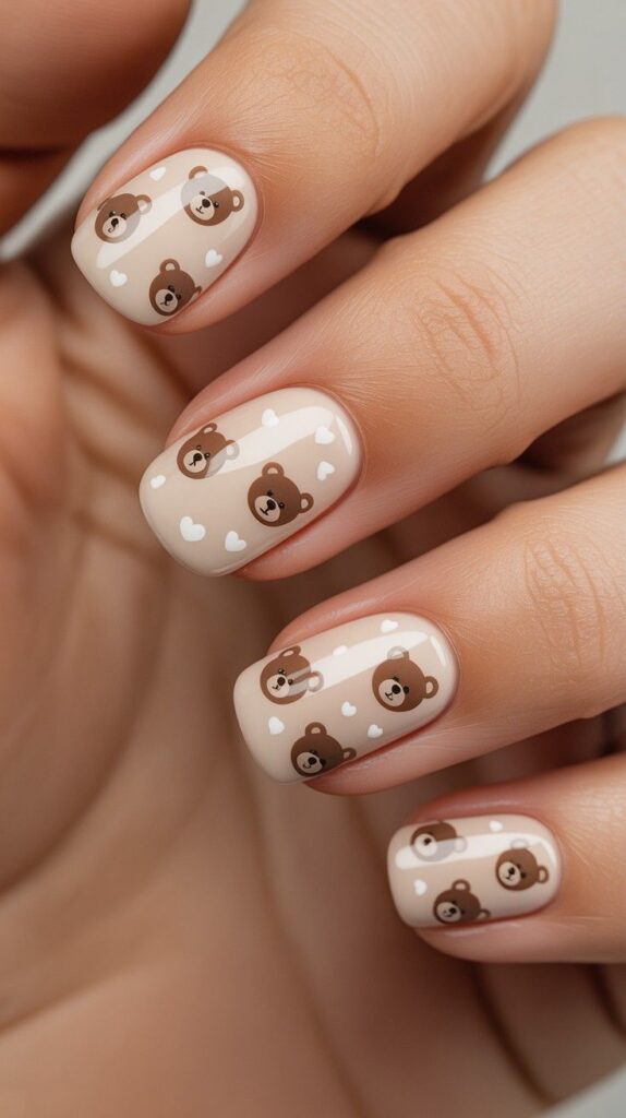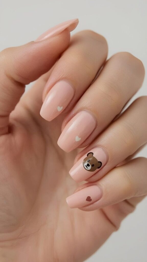 Clean nude polish meets bold cartoon teddy bear and brown hearts — modern, chic, and perfect for showing off your winter boots. The matte-to-glossy gradient adds depth, while the minimalist base lets the design shine. Paired with real snowflakes, this design whispers ‘minimalist magic’ with every step.