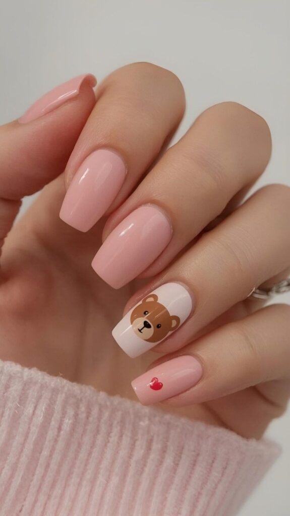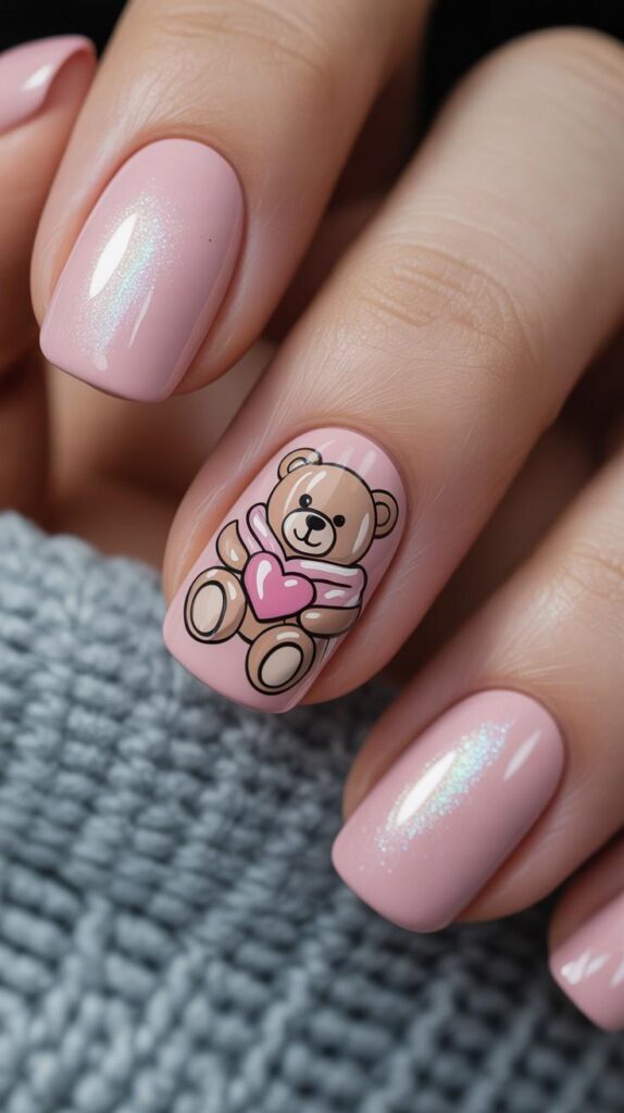 Soft pink polish meets bold cartoon teddy bear holding a pink heart — modern, chic, and perfect for showing off your winter boots. The matte-to-glossy gradient adds depth, while the minimalist base lets the design shine. Paired with real snowflakes, this design whispers ‘minimalist magic’ with every step.