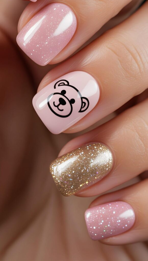 16) Pink & Teddy Face French Tip Accent