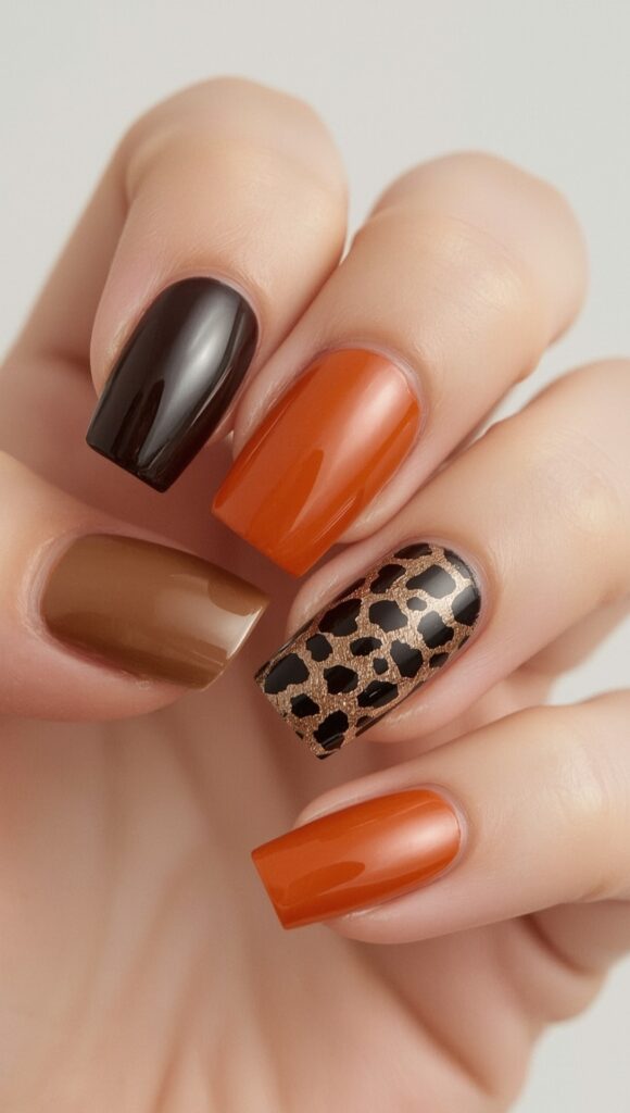 A mix of brown and orange bases features one accent nail with a gold leopard print. The warm contrast adds a cozy, seasonal charm to the compact shape.