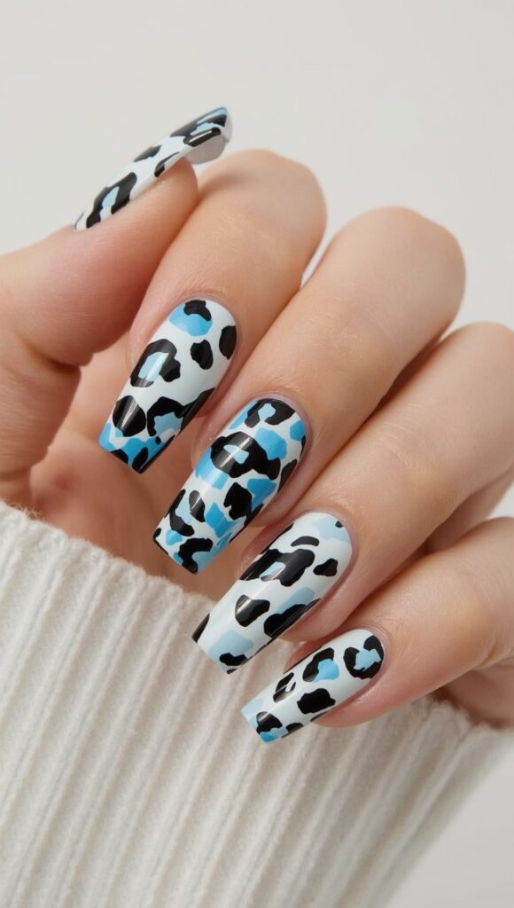 A soft blue and white base features black leopard spots on each nail. The cool tone adds a fresh, modern twist to the classic animal print.