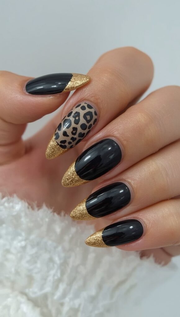 A sleek black base features gold tips and one accent nail with leopard print. The luxurious detail adds a glamorous, edgy touch to the minimalist design.