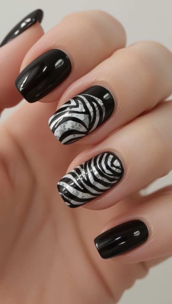 A deep black base features two accent nails with silver zebra stripes. The metallic detail adds a sleek, futuristic flair to the dramatic design.