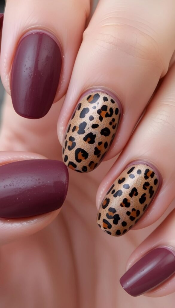 A deep maroon base features two accent nails with classic leopard print. The bold contrast adds a warm, autumnal flair to the rich tone.
