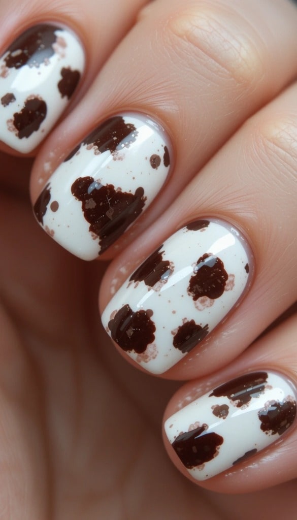 A soft white base features brown cow print spots on each nail. The playful pattern adds a cozy, rustic charm to the clean finish.