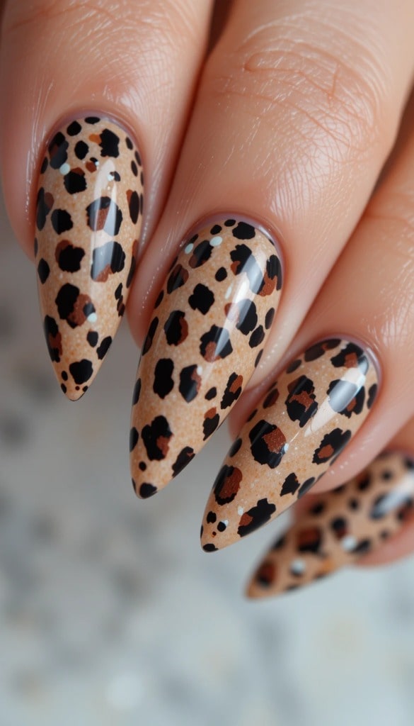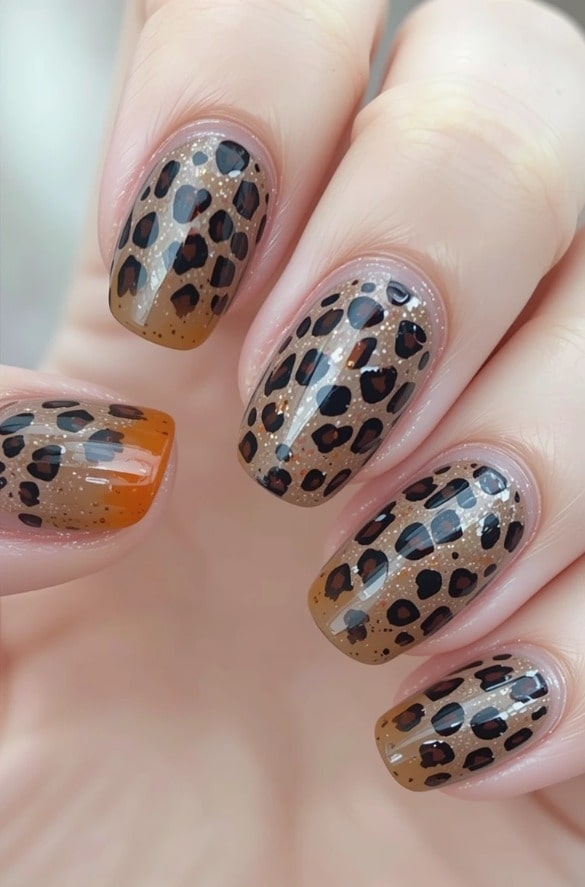 A warm tan base features black leopard spots on each nail. The bold pattern adds a wild, autumnal charm to the sleek finish.