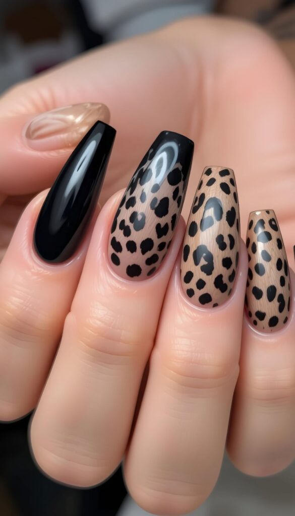 A deep black base features two accent nails with leopard print. The bold contrast adds a wild, autumnal flair to the sleek design.