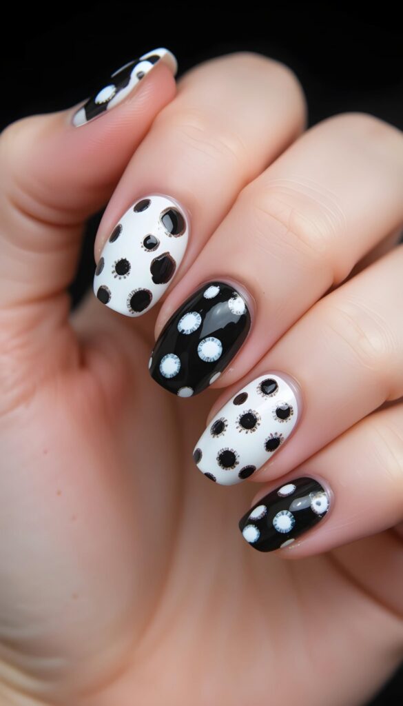 A mix of black and white bases features polka dots on each nail. The playful pattern adds a fun, retro charm to the clean finish.
