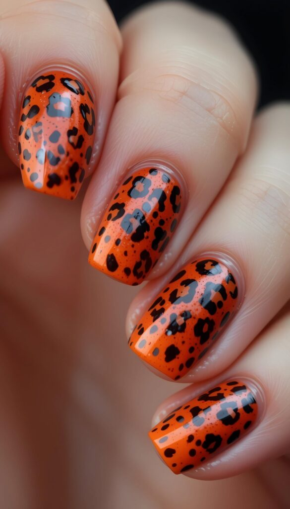 A vibrant orange base features black leopard spots on each nail. The bold contrast adds a fiery, animal-inspired flair to the compact shape.