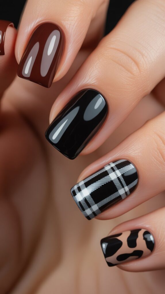 A rich brown base features one accent nail with black plaid and another with leopard print. The bold mix adds a wild, autumnal charm to the dramatic palette.