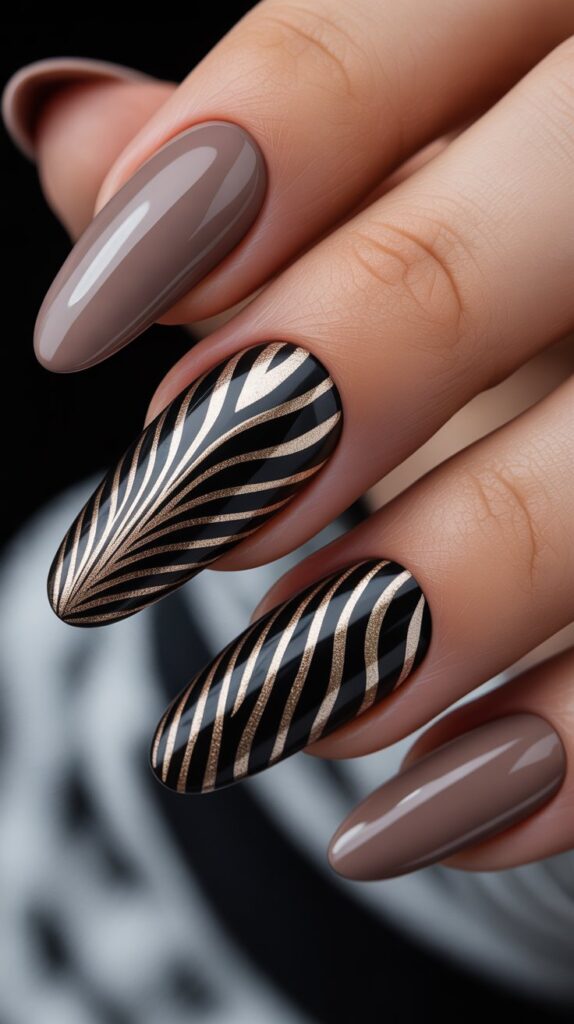 A warm taupe base features two accent nails with black and gold zebra stripes. The bold contrast adds a modern, luxurious flair to the compact shape.