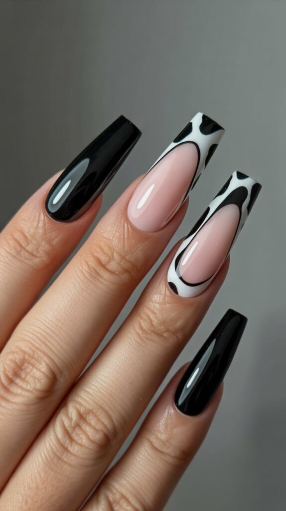 A mix of black and white cow print nails features one nude accent nail. The sleek design adds a modern, artistic touch to the classic pattern.