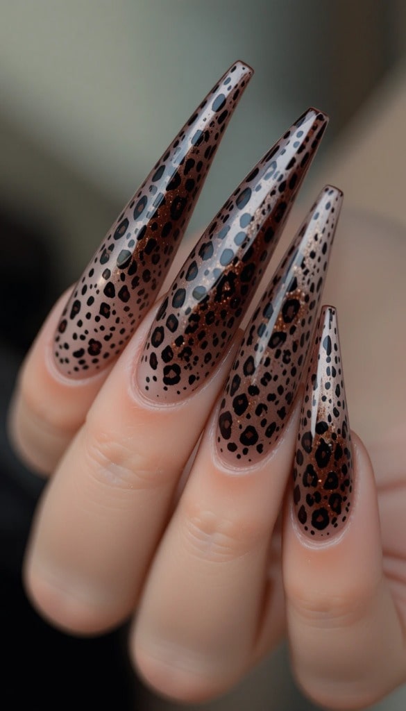 A sleek tan base features black leopard spots on each long stiletto nail. The bold pattern adds a fierce, dramatic flair to the elegant shape.