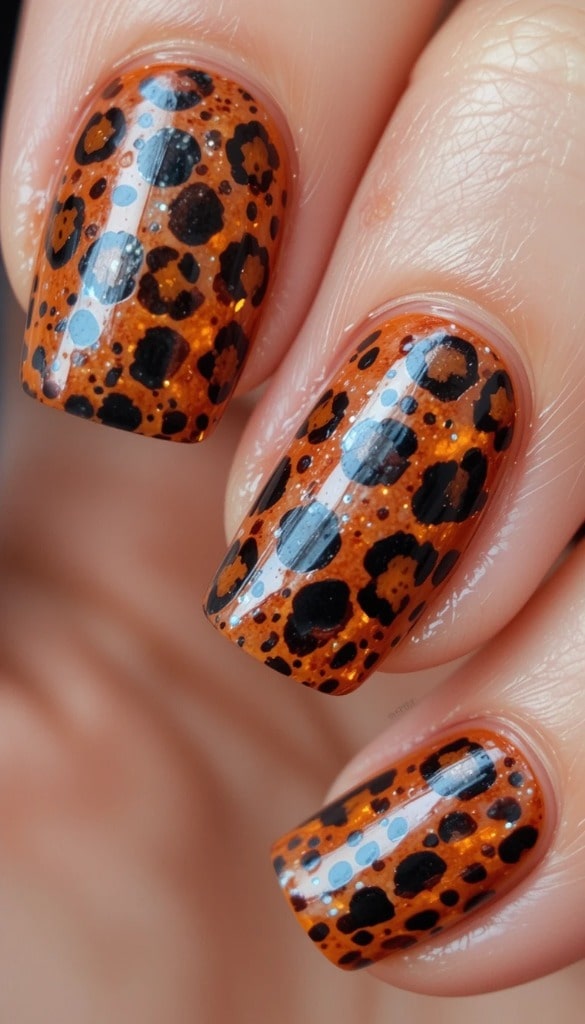 20) Orange Nails with Glitter Leopard Print