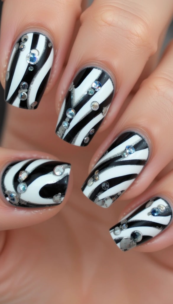 A black and white zebra print base features rhinestones on each nail. The sparkling details add a glamorous, festive flair to the classic pattern.