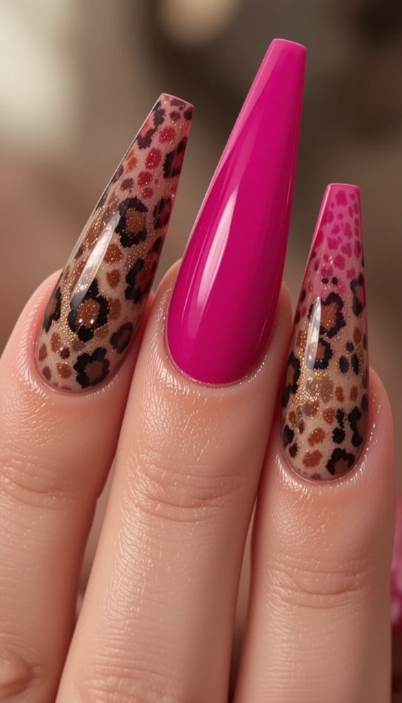A vibrant pink base features two accent nails with leopard print. The bold contrast adds a playful, fashion-forward flair to the dramatic palette.
