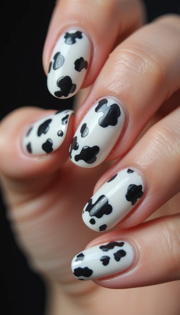 A soft white base features black cow spots on each nail. The playful pattern adds a cozy, rustic charm to the clean finish.