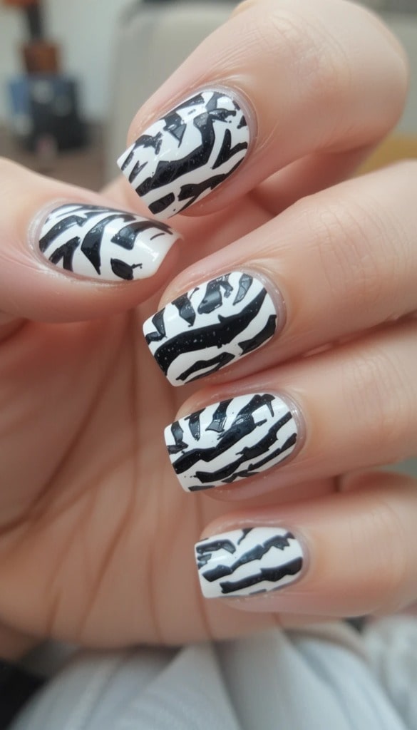 A white base features black zebra stripes on each nail. The dramatic pattern adds a wild, modern flair to the compact shape.
