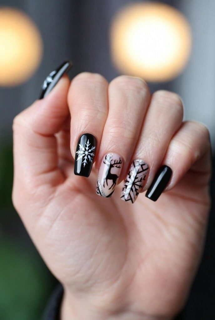 “Glossy black polish frames delicate white snowflakes on each nail, while the ring finger steals the show with a giant reindeer face — complete with antlers and a red nose. It’s clean, elegant, and totally photo-ready — like wearing a winter art exhibit on your fingertips.”