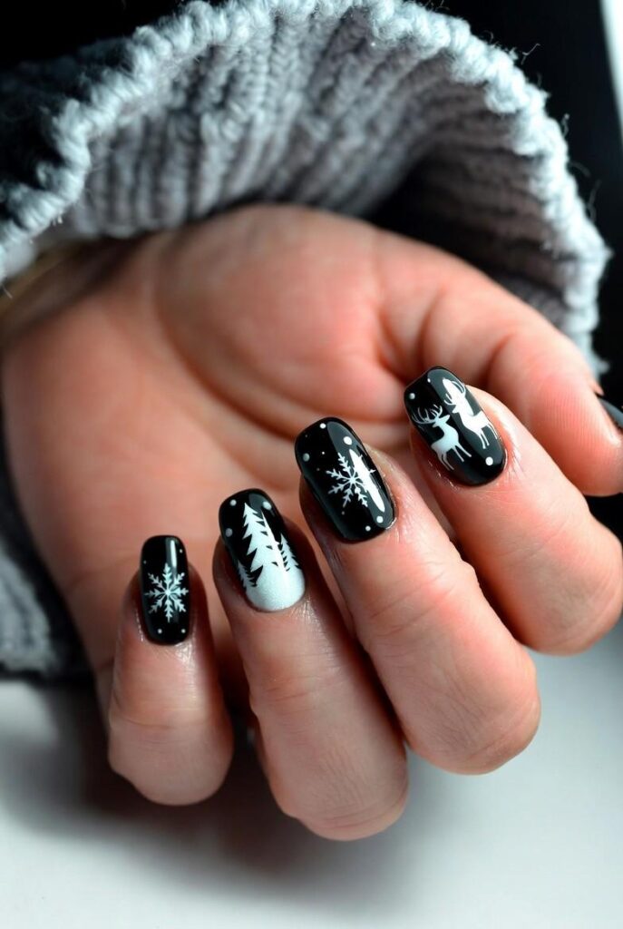 “Glossy black polish frames crisp white stripes on two nails, while the ring finger steals the show with a giant snowflake with black reindeer. The rest? Clean, classic, and totally low-key — chic, understated, and perfect for everyday wear.”