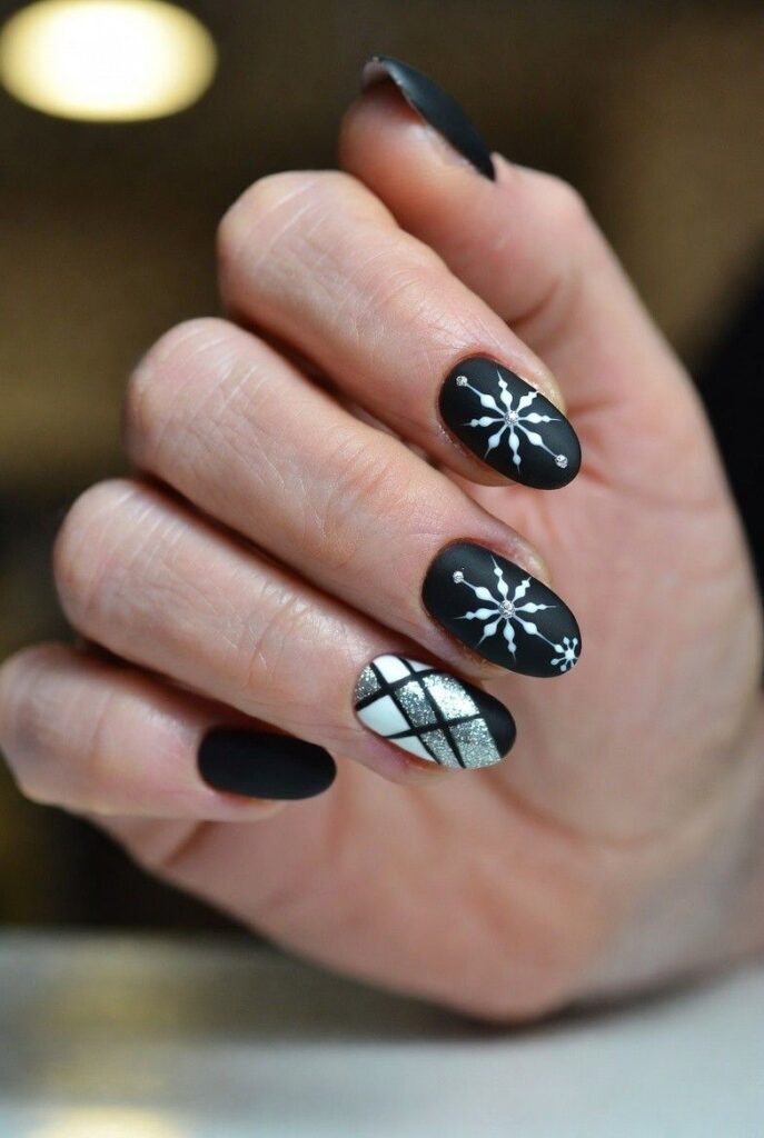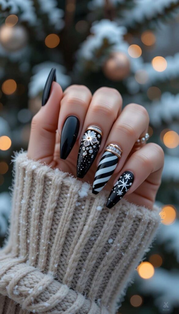 “Glossy black polish frames delicate silver and gold snowflakes on each nail — simple, bold, and totally festive. It’s like your nails are ready for a holiday parade — fun, flirty, and packed with joy.”