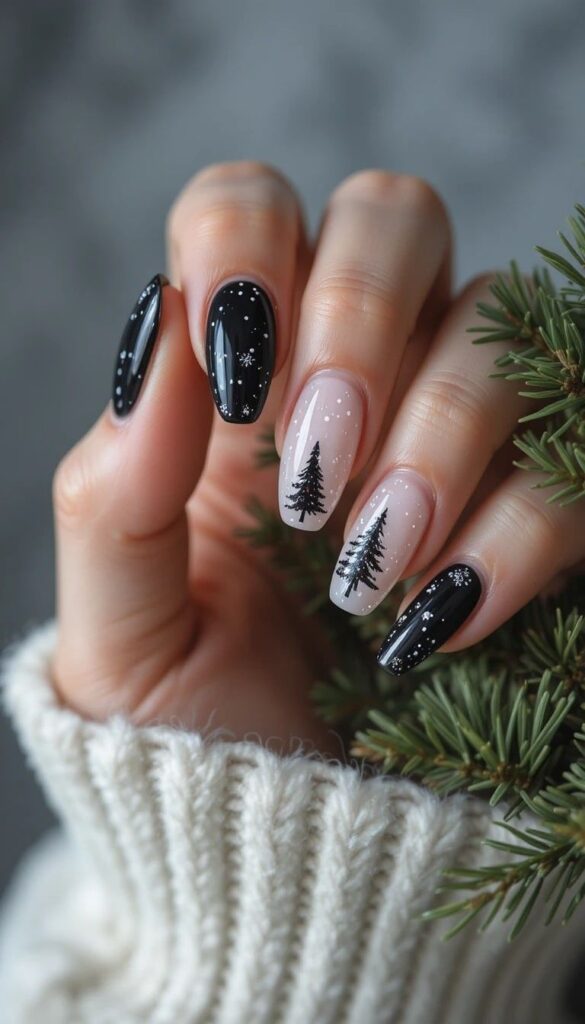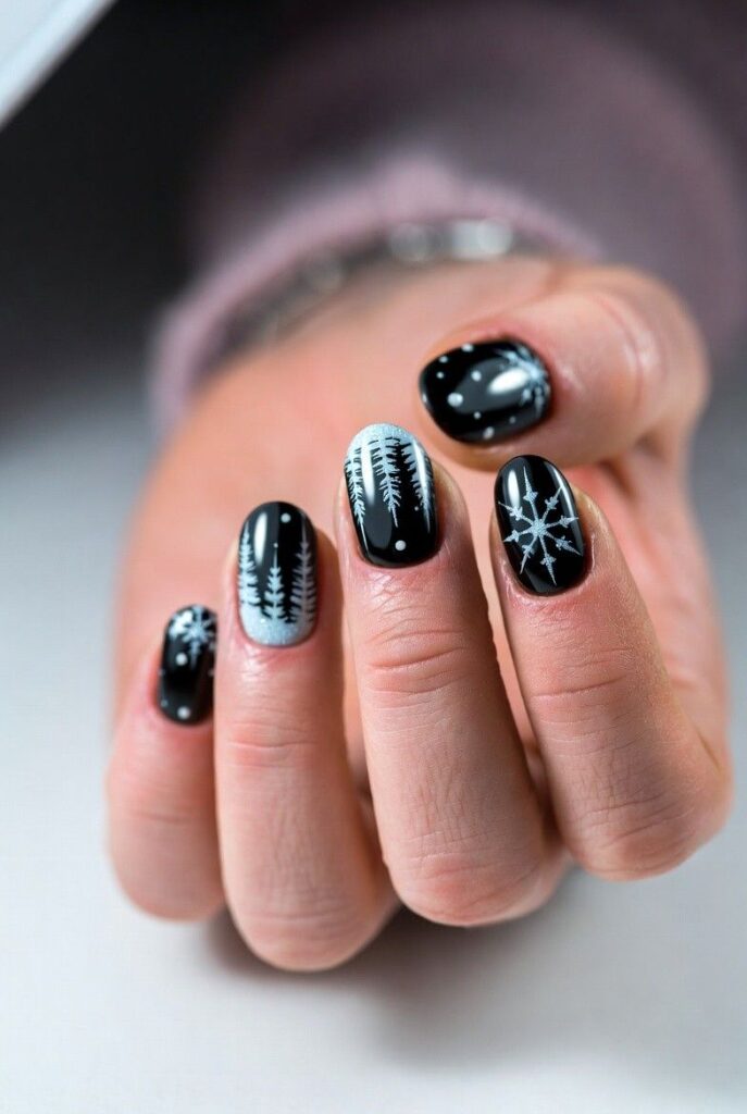 “Glossy black polish frames delicate white snowflakes on each nail, while the ring finger steals the show with a giant Christmas tree — complete with a gold star. It’s clean, elegant, and totally photo-ready — like wearing a winter art exhibit on your fingertips.”