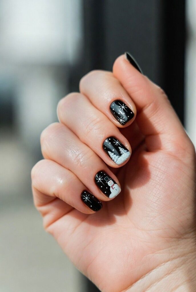 “Glossy black polish frames delicate white snowflakes on each nail, while the ring finger steals the show with a tiny snowman face — complete with a red hat and scarf. The other nails? Sprinkled with micro-glitter for that ‘twinkling night sky’ vibe — charming, not childish.”