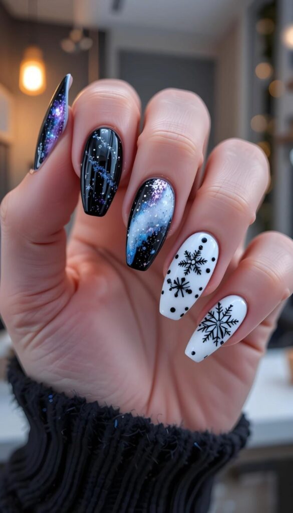 “Glossy black polish frames delicate white snowflakes on each nail, while the ring finger steals the show with a giant galaxy accent that sparkles like fresh snow. The rest? Clean, classic, and totally low-key — chic, understated, and perfect for everyday wear.”