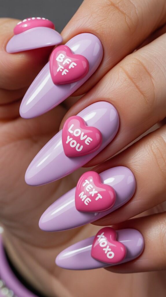 Soft lavender short stiletto nails featuring oversized 3D candy hearts stamped with playful phrases: “BFF”, “LOVE YOU”, “TEXT ME”, and “XOXO” — sweet, sassy, and full of Gen-Z charm. The glossy finish enhances the realism, and the sharp shape adds modern edge. Friendship, served with sprinkles.