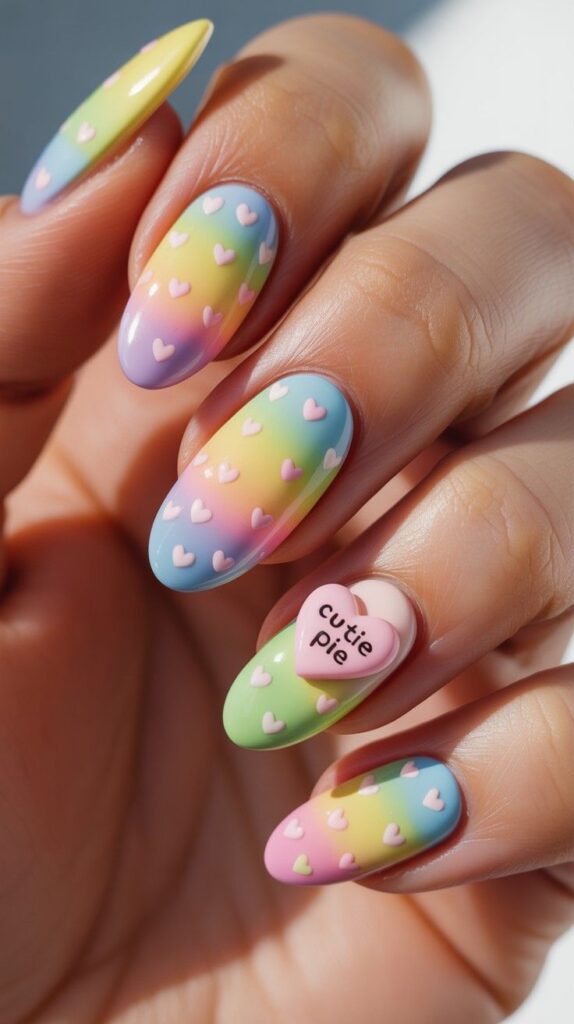 Vibrant rainbow-gradient short nails (yellow → pink → blue) covered in mini pastel hearts, plus one playful accent with a 3D pink heart stamped “cutie pie” — whimsical, energetic, and utterly charming. The glossy finish unifies the palette, and the short shape keeps it wearable. Joy, in full spectrum.