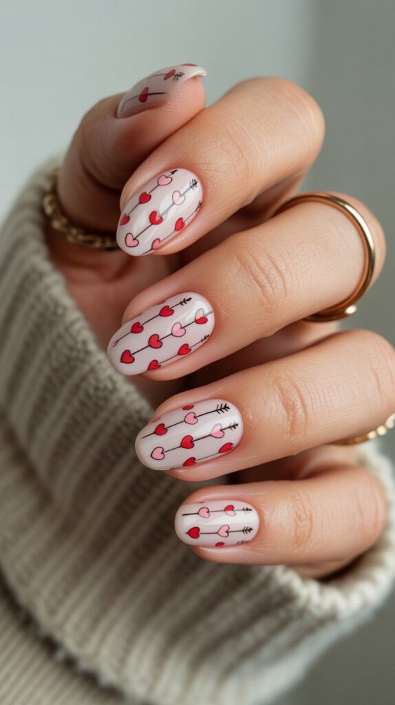 Soft nude short almond nails adorned with delicate black-arrow chains linking mini red and pink hearts — sweet, rhythmic, and full of romantic motion. The glossy finish enhances the precision of the line art, while the compact shape ensures comfort for real life. Like a love story drawn in candy ink.