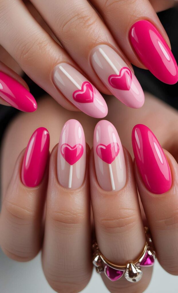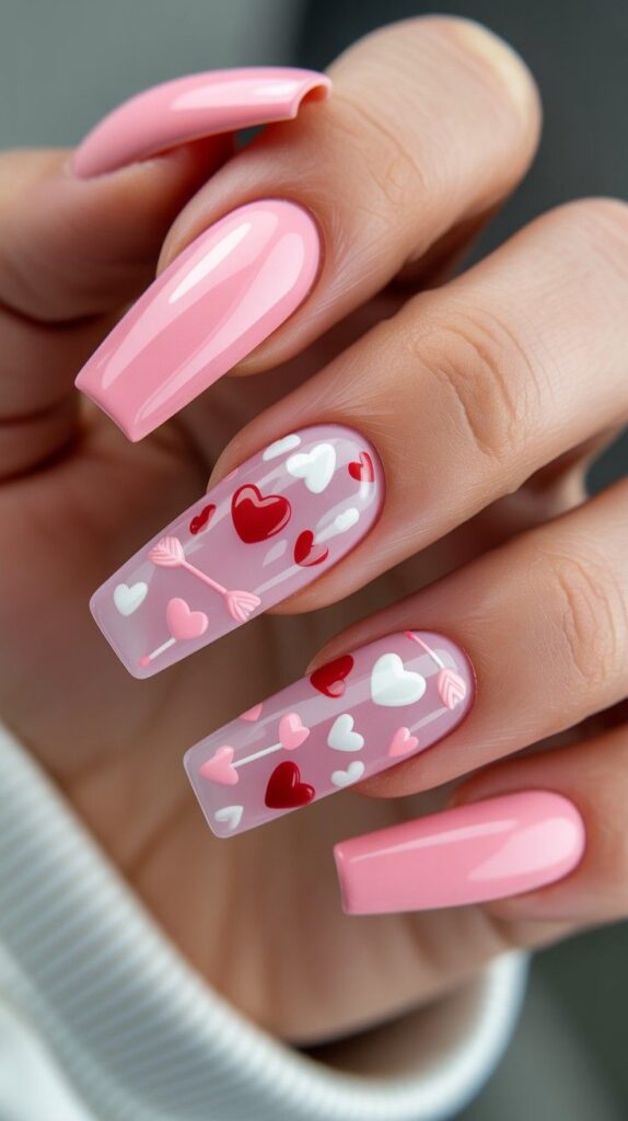 Glossy pink short coffin nails adorned with mini red/white hearts, tiny pink arrows, and subtle glitter — joyful, flirty, and full of movement. The high-shine finish makes the details pop, and the short length keeps it practical for daily wear. Love, delivered with a wink.