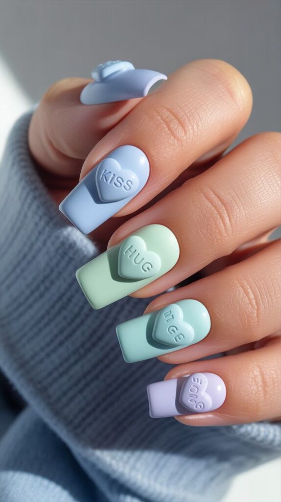 Short squoval nails in soft mint, lilac, seafoam, and baby blue — each featuring a 3D candy heart stamped with sweet phrases: “KISS”, “HUG”, “SONG”, and “LOVE”. The matte-gloss contrast adds realism, and the compact shape ensures durability. A love note you wear on every finger.