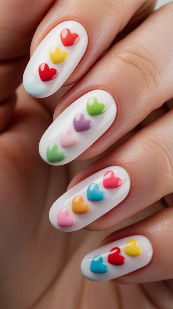 Crisp white short coffin nails covered in scattered mini 3D hearts in red, yellow, green, blue, pink, and purple — vibrant, joyful, and full of childlike wonder. The glossy finish makes the colors sing, and the compact shape keeps it effortlessly wearable. Pure, unfiltered happiness on your fingertips.