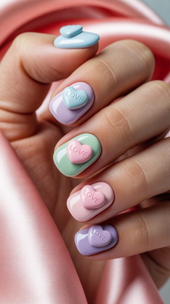 Nude base short oval nails layered with oversized 3D candy hearts in pastel blue, mint, pink, and lavender — each inscribed with “LOVE” in delicate script. The soft color harmony feels cohesive yet playful, and the compact shape ensures comfort for typing, hugging, or holding coffee. Romance, served with sprinkles.