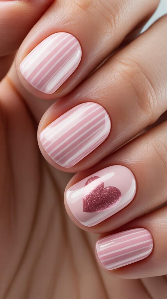 Glossy pink-and-white striped short oval nails meet one accent finger featuring a sparkling glitter-red heart — cheerful, rhythmic, and full of movement. The high-shine finish enhances the candy-like texture, and the short length keeps it practical for typing, texting, or holding hands. A sugar rush, beautifully bottled.