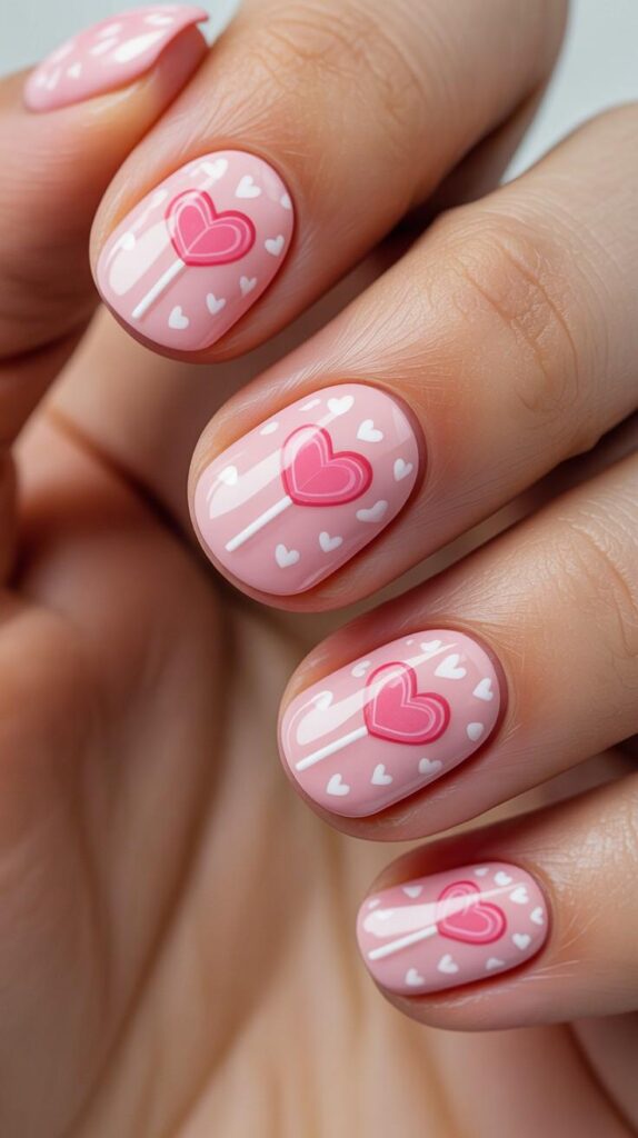 Delicate pink short nails decorated with glossy 3D lollipop hearts on white sticks — whimsical, tender, and utterly nostalgic. The raised detail is smooth to the touch, and the compact shape makes this design surprisingly durable (no snagging!). Like a pocket-sized treat for your fingertips.