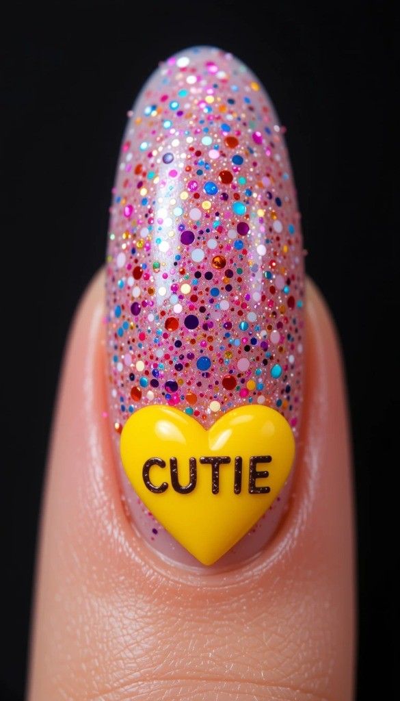 A single dramatic stiletto nail covered in dense multicolor glitter, crowned with a bold yellow 3D heart stamped “CUTIE” in chocolate brown — maximalist, confident, and irresistibly sweet. The contrast between explosive sparkle and clean typography is pure 2026 energy. This isn’t just a nail — it’s a declaration.